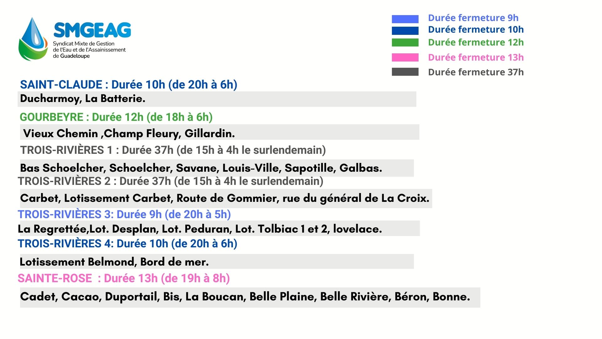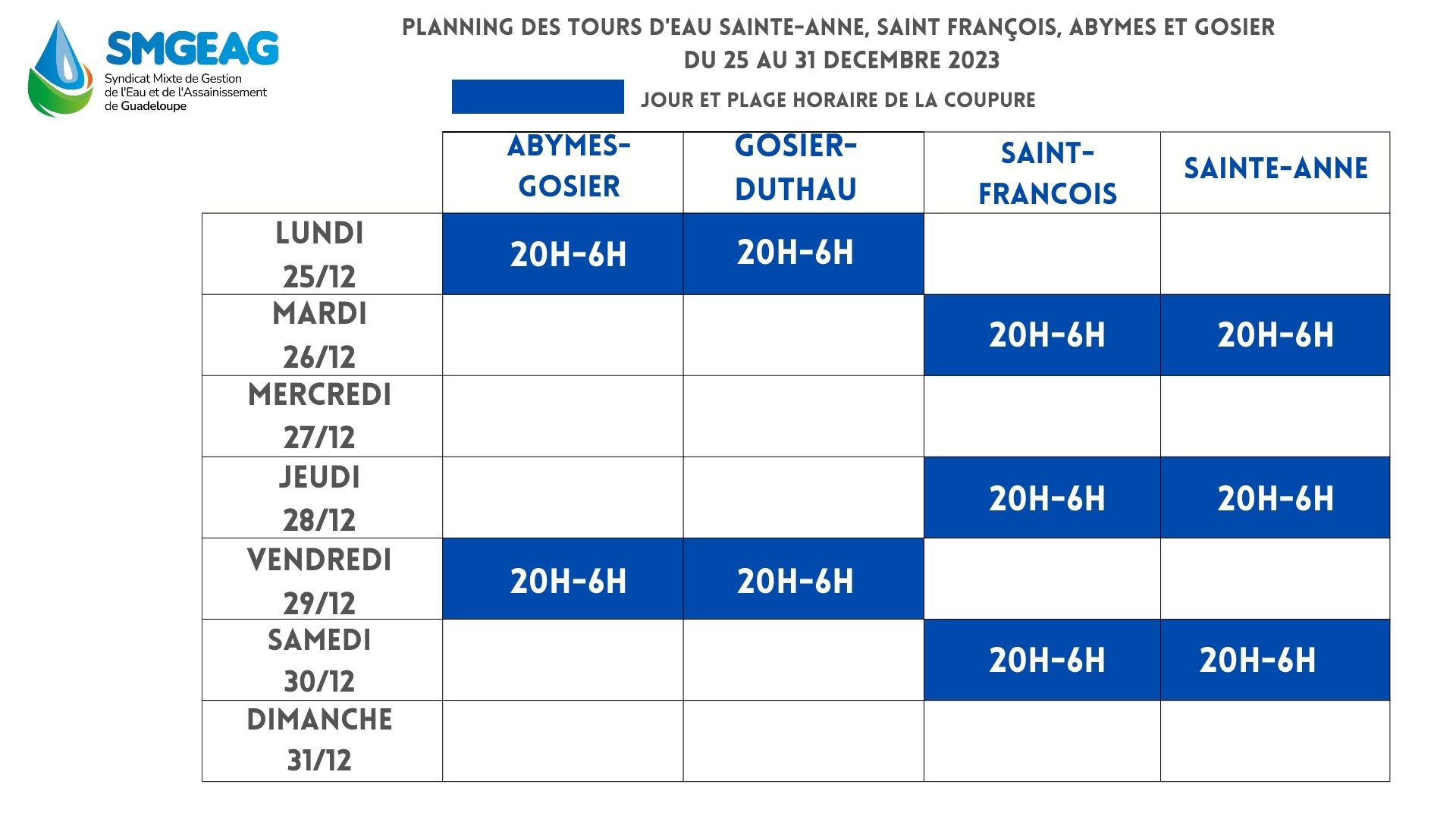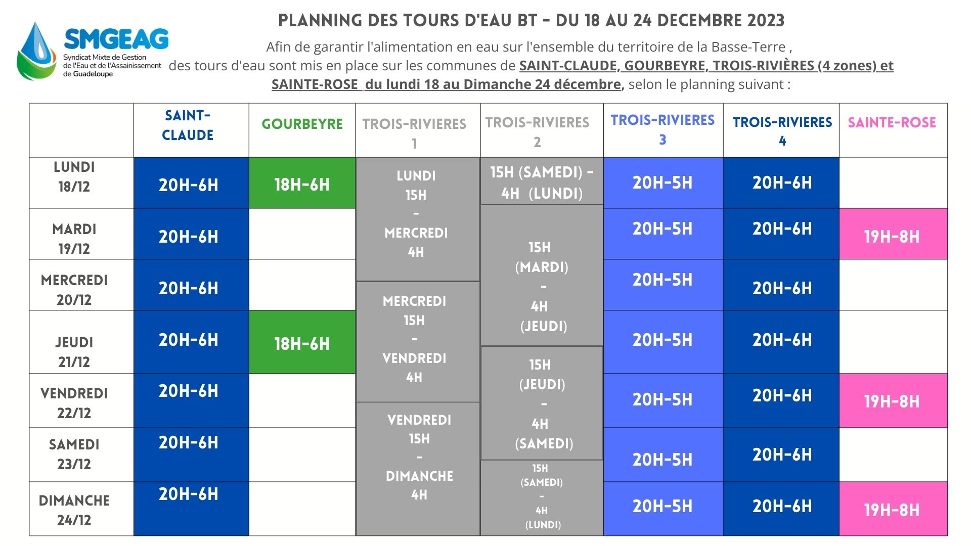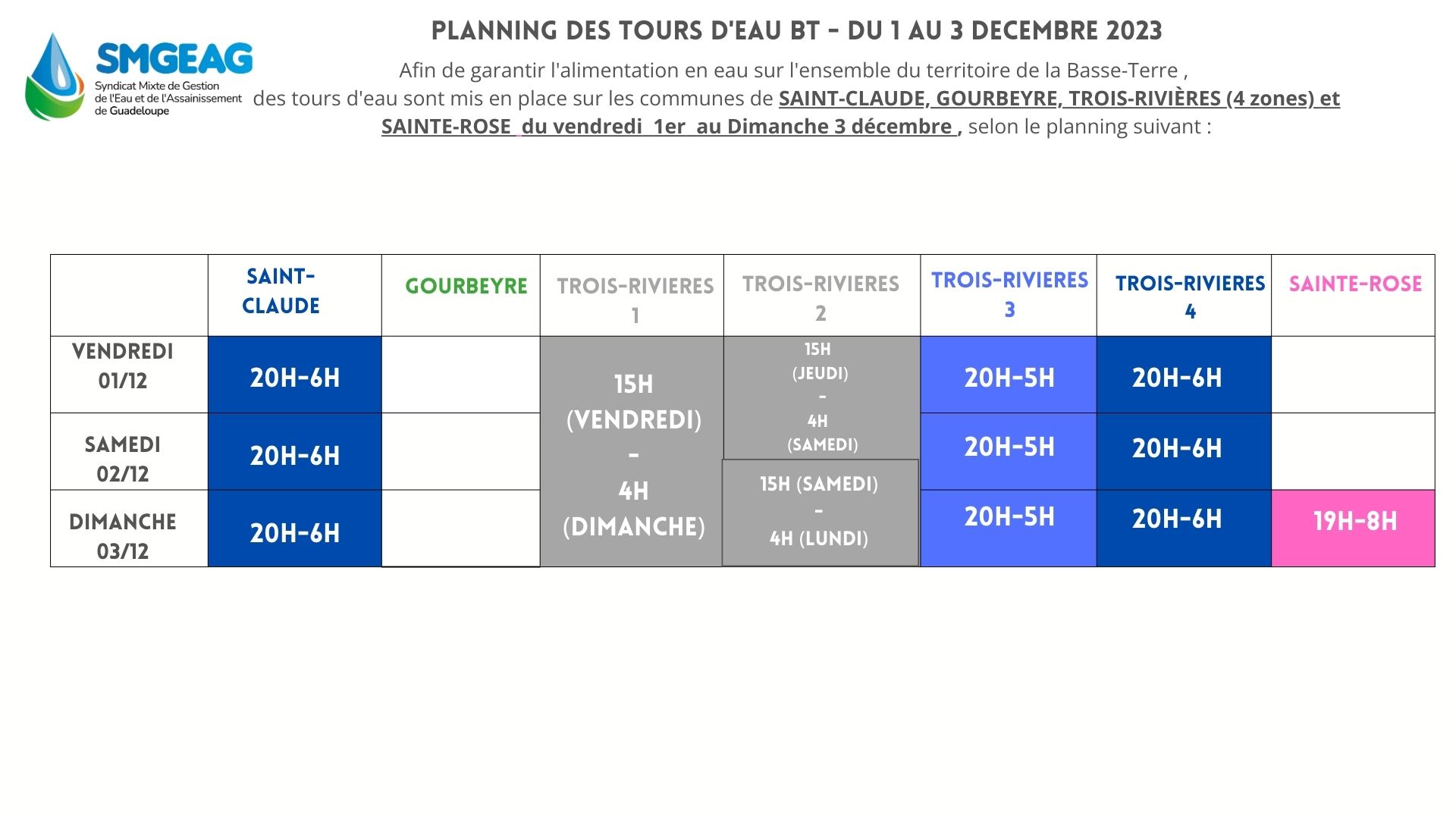 Planning des tours d'eau territoires Basse-Terre et Grande-Terre jusqu'au 31 décembre