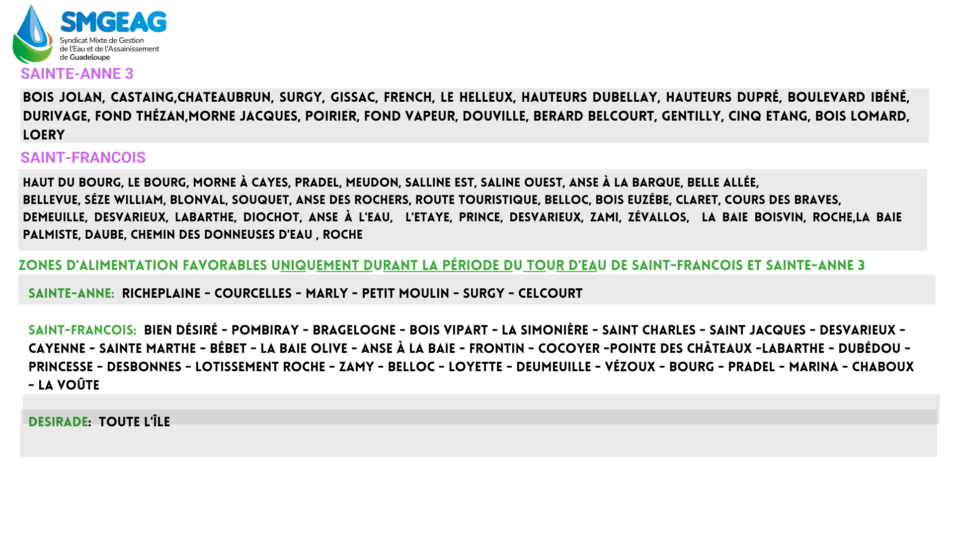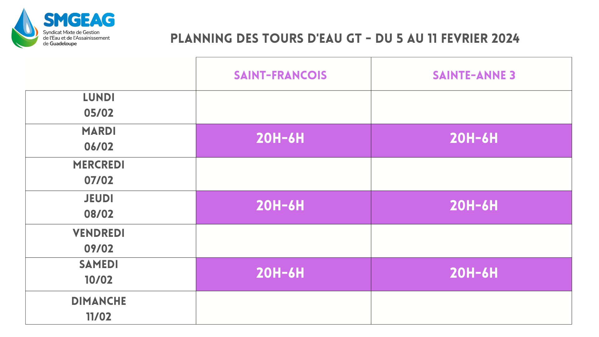 Planning des tours d’eau du 5 au 11 février : Saint-François et Sainte-Anne