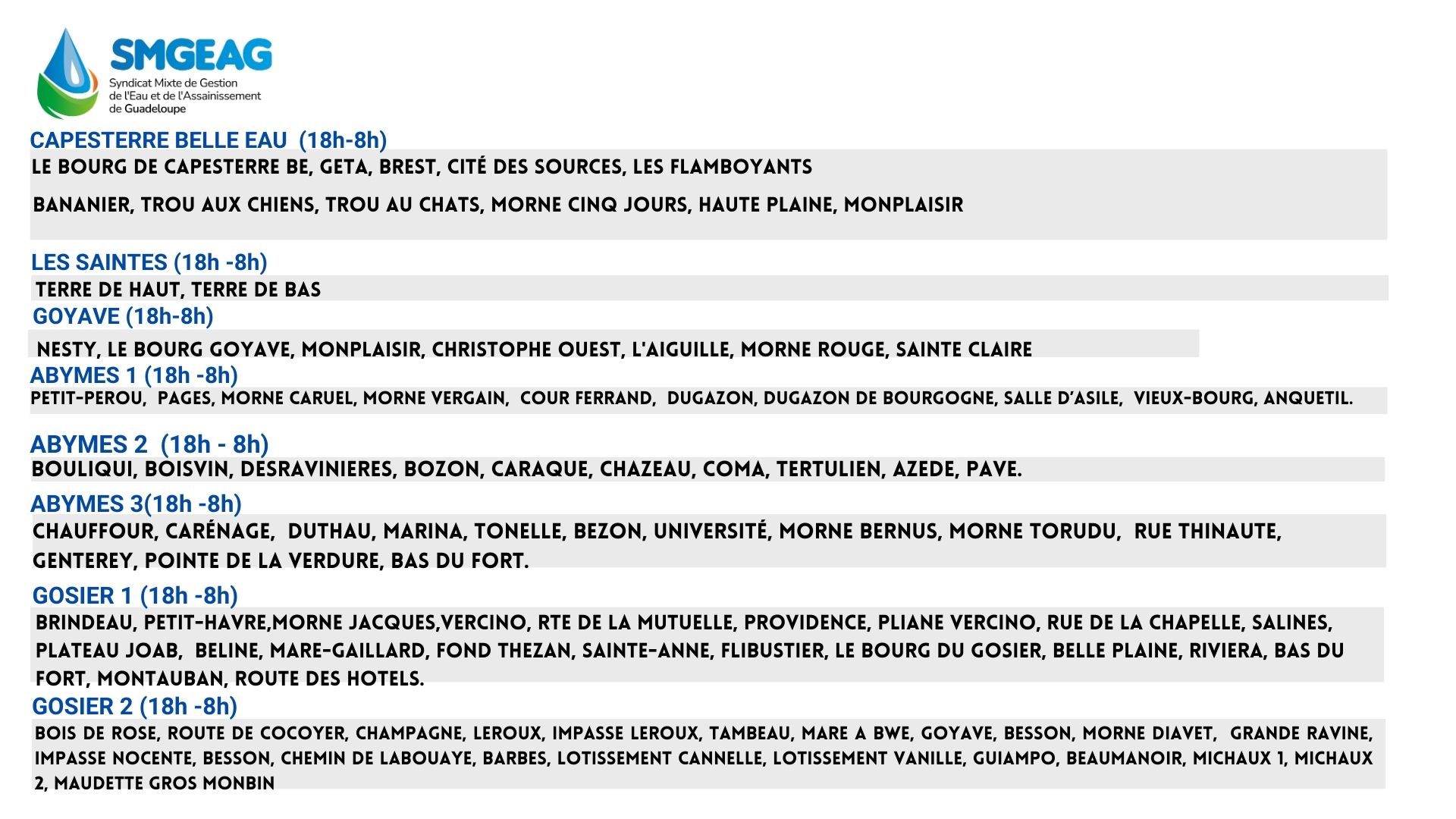 Planning des tours d'eau: Capesterre-Belle-Eau, Les Saintes, Goyave, Les Abymes et Le Gosier jusqu'au 21 avril