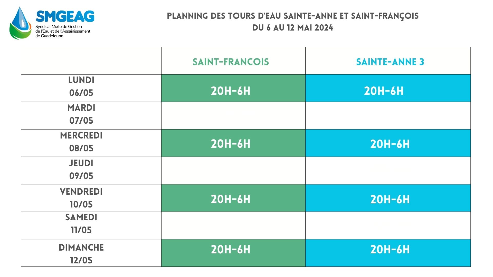 Planning des tours d'eau Sainte-Anne et Saint-François jusqu'au 12 mai