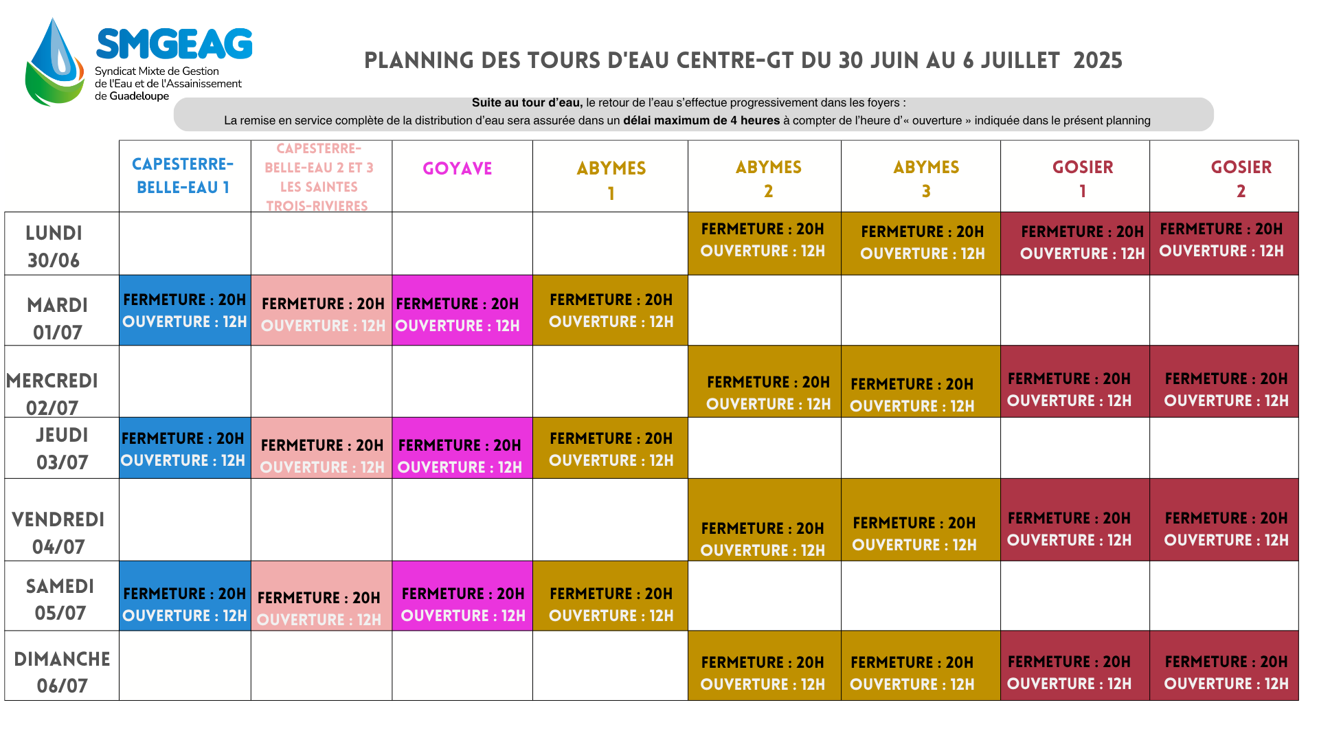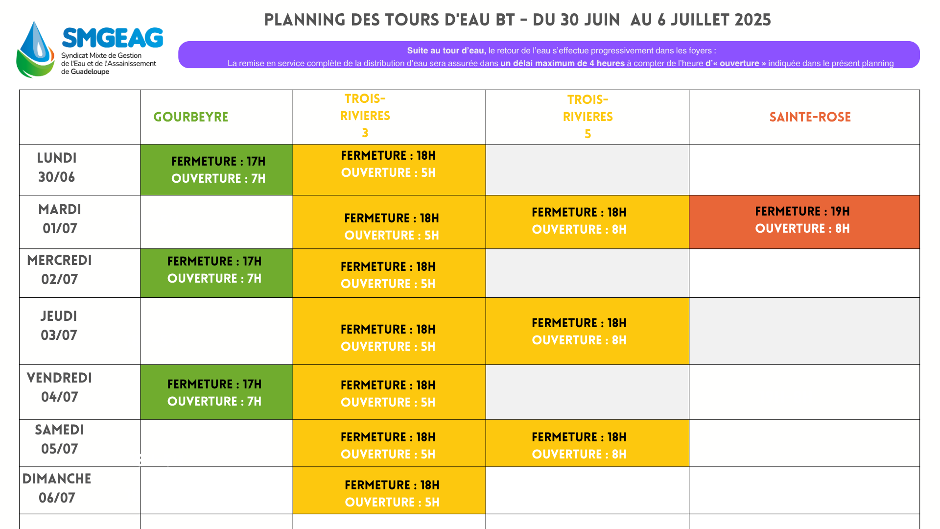 Planning des Tours d'Eau du 30 Juin au 6 Juillet 2025