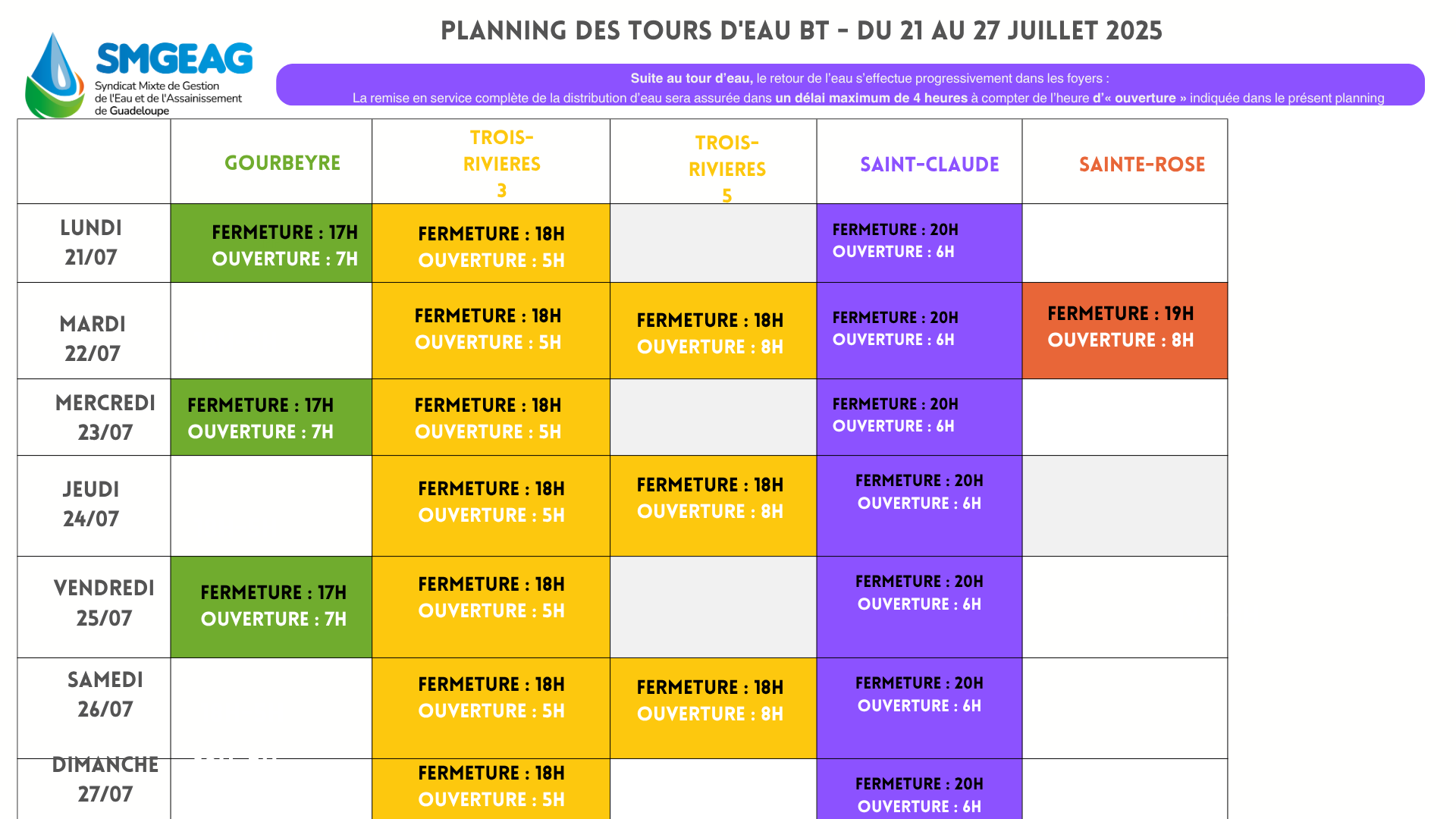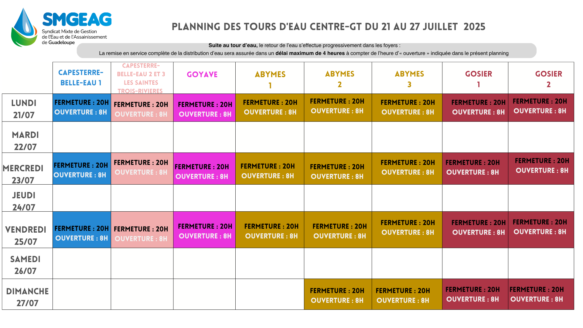 Planning des tours d’eau du 8 au 14 septembre 2025