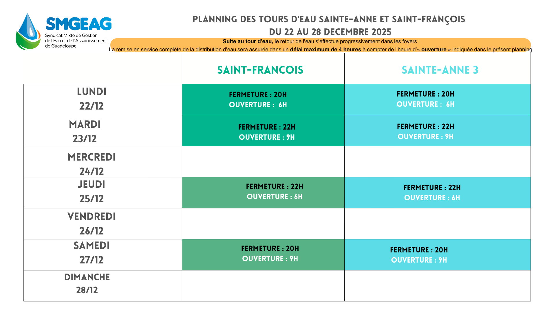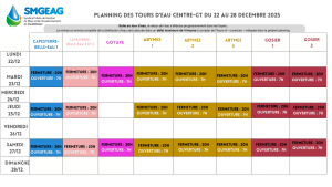Planning des tours d’eau du 15 au 21 décembre 2025